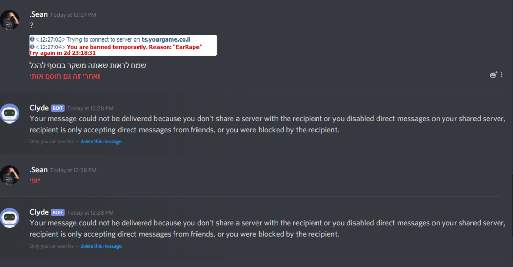 שם פרטי:שון ID (איידי):?? סיבת ההרחקה (מדוייק):אירייפ האם אחזור על מעשיי: לא עשיתי כלום... למה עשיתי את זה:לא עשיתי את זה הערות, בקשות, שאלות: אני היום נכנס לטים ספיק מבקש מדור להעביר אותי, אנחנו מדברים קצת ויוצא מהטים ספיק. ולאחר מספר דקות אני בא לחזור לטים ספיק, ומגלה שאני בבאן על "אירייפ" ואני לא עשיתי אירייפ בכלל. כמובן שאחרי שזה קרה אני רשמתי לדור לגבי הבאן כי רציתי לברר איתו ואחרי זה הוא חסם אותי בדיסקורד פשוט. עצוב לי מאוד שזה הפנים של הקהילה הזאת והמקרה הזה מאוד מעציב אותי אבל אני רק מקווה שיורידי לי את הבאן כי לא עשיתי שום אירייפ והבאן הוא לא מוצדק. נ"ב: לא לנעול את האשכול אחרי התשובה שלכם.