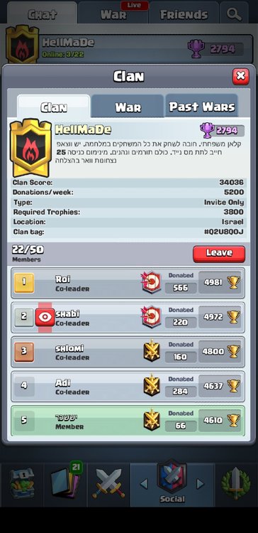 https://link.clashroyale.com/invite/clan/en?tag=Q2U8Q0J&token=9kkjms42&platform=android חובה שיהיה לכם 10 ימי נצחון בוור יש לנו גם קבוצה ווצאפ