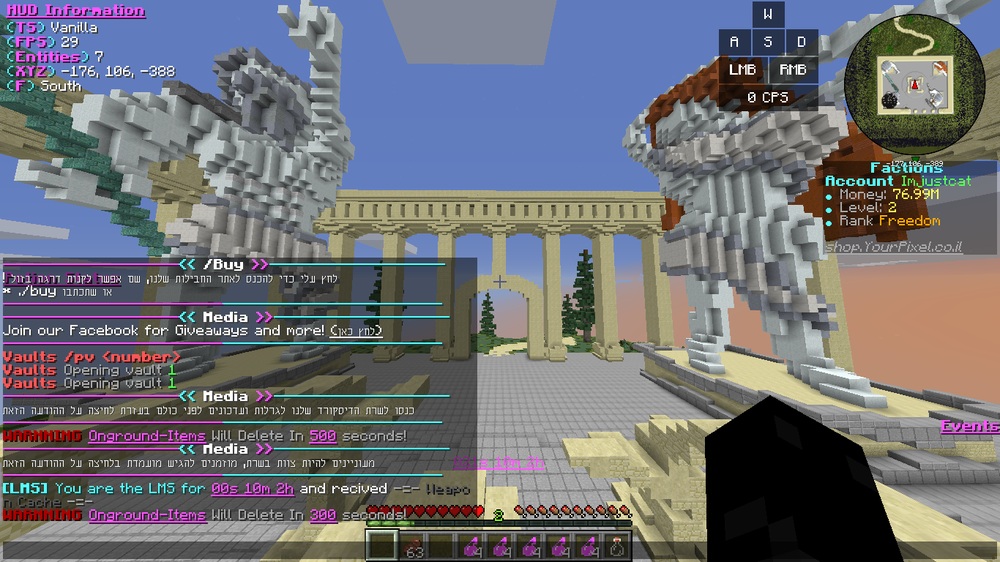 שלום לכל שחקני השרת, היום היה לנו באג בשרת הפקשיינס שבגללו נמחקו כל הפקשיונס בשרת. אנו מבקשים מכל שחקן להכנס לשרת על מנת לעשות קליים לבסיס שלו ולהוסיף את השחקנים בחזרה לפתוח את הפקשיונס. *שחקן אשר יעשה קליים לבסיס שלא שלו יקבל באן. בגלל הבאג כל שחקן יקבל פיצוי, יש לפנות אליי (CreeperOfTerror) בשביל לקבל את הפיצוי. סליחה על אי הנוחות, צוות יורפיקסל