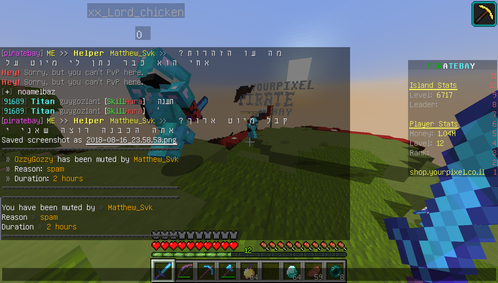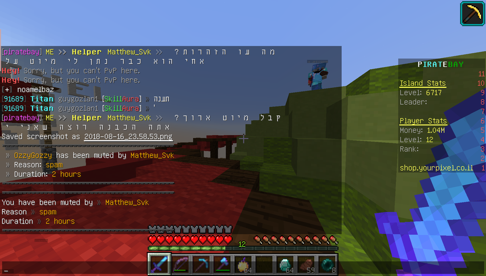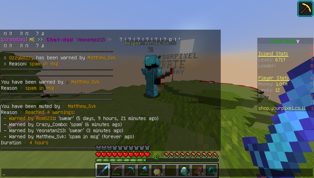 שם שלי:OzzyGozzy שמות חברי הצוות: Yhonatan231 Matthew_svk סיבת המיוטים:ספאם תיאור המקרה:חבר צוות אחד הזהיר אותי על זה שמכרתי לאחד מחברי הצוות משהו והוא לא בא אחרי הרבה דקות שקראתי לו לקבל את הדברים ואז אני כעשר דקות פשוט שאלתי אותו על מה ההזהרה והוא לא ענה אז קצת הספמתי ואז שאלתי חבר צוות אחר למה ויהונתן נתן לי מיוט כעבור כמה דקות של המיוט מטטיהו נתן לי הזהרה בלי שום סיבה וקיבלתי עוד מיוט ואחרי ששאלתי אותו בפרטי למה הוא נתן לי עוד מיוט ואחר כך עוד אחד כי סתם בא לו מקווה ששניהם יקבלו באן כי ממש התהפקתי לא לקלל אותם תודה מראש עוז