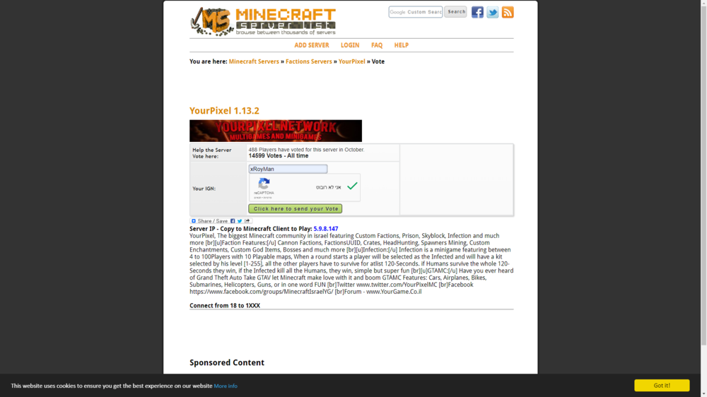 זהו מדריך איך לעשות ווט (Vote) בשרת הסליים טאק שלנו לכל מי שלא יודע תיגשו לתיבת הווט (vote) שבספאון ותרשמו את הפקודה vote/ הפקודה תפתח רשימה גדולה של קישורים שאליכם ללחוץ אחד אחד על כפתור הYes וכאשר תגיעו לאתרים תרשמו שם את השם שלכם במשחק ותמלאו את מה שכפתור ה"אני לא רובוט" מבקש תלחצו על כפתור הVote אחרי זה תשתמשו במפתחות שקיבלתם על התיבה של הווט בכפתור הימני וגם תזכו בפרסים שיעזרו לכם במשחק וגם תעזרו לקדם את השרת שלנו ! שווה לא ?