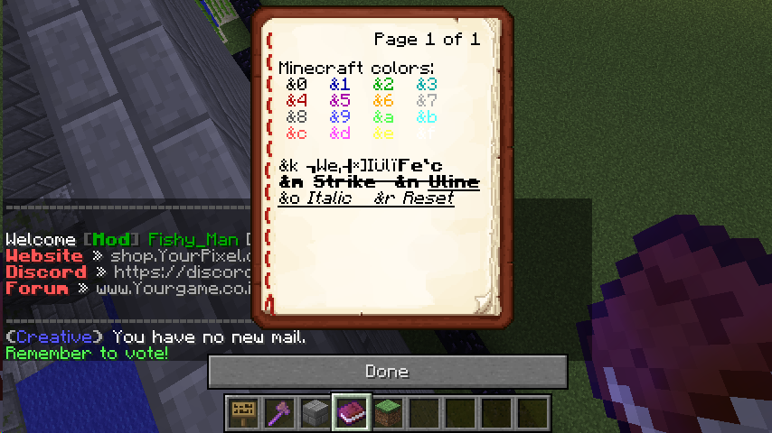 TrevorGalKiller 151 יוצר/ת האשכול פורסם 2019 במרץ 10 TrevorGalKiller YourGame Semi-Pro שי 151 2.4k הודעות שלום לכולם, באשכול הזה רציתי לשלוח לכם אתר, שבו אתם תוכלו איך לדעת ולהשתמש בצבעים במיינקראפט. לחץ כאן כדי להשתמש בצבעים תצטרכו לרשום טקסט & ומספר. עברית: דוגמא: זה יוצא ככה: באנגלית זה הפוך, אתם תצטרכו לרשום את הקוד קודם, ולאחר מכן את הטקסט: אנגלית דוגמא: זה יוצא ככה: זהו, זה כל ההסבר, מקווה שנהניתם ולמדתם, כדי לדעת איך משתמשים בכל הצבעים והאופציות תכנסו לקישור ששלחתי לכם! TrevorGalKiller מודרייטור בקהילת יורפיקסל discord: TrevorGalKiller#1178Teamspeak: TrevorGalKiller Forum: https://www.yourgame.co.il/profile/10811-trevorgalkiller/ קישור ישיר להודעה שתף באתרים אחרים More sharing options...
